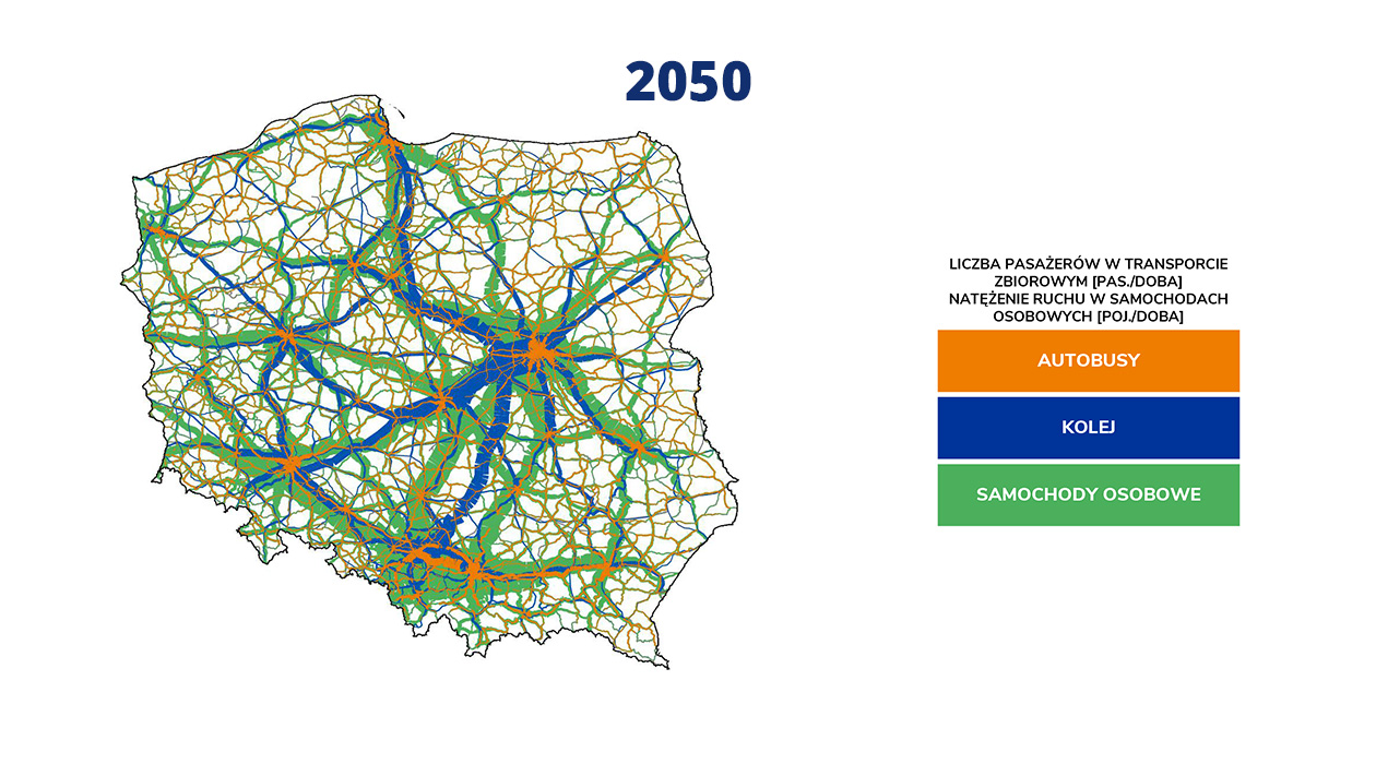 Wyniki Modelu ZMR przedstawiają natężenia ruchu na odcinkach kolejowych oraz drogowych w podziale na transport indywidualny i zbiorowy (autobusy).